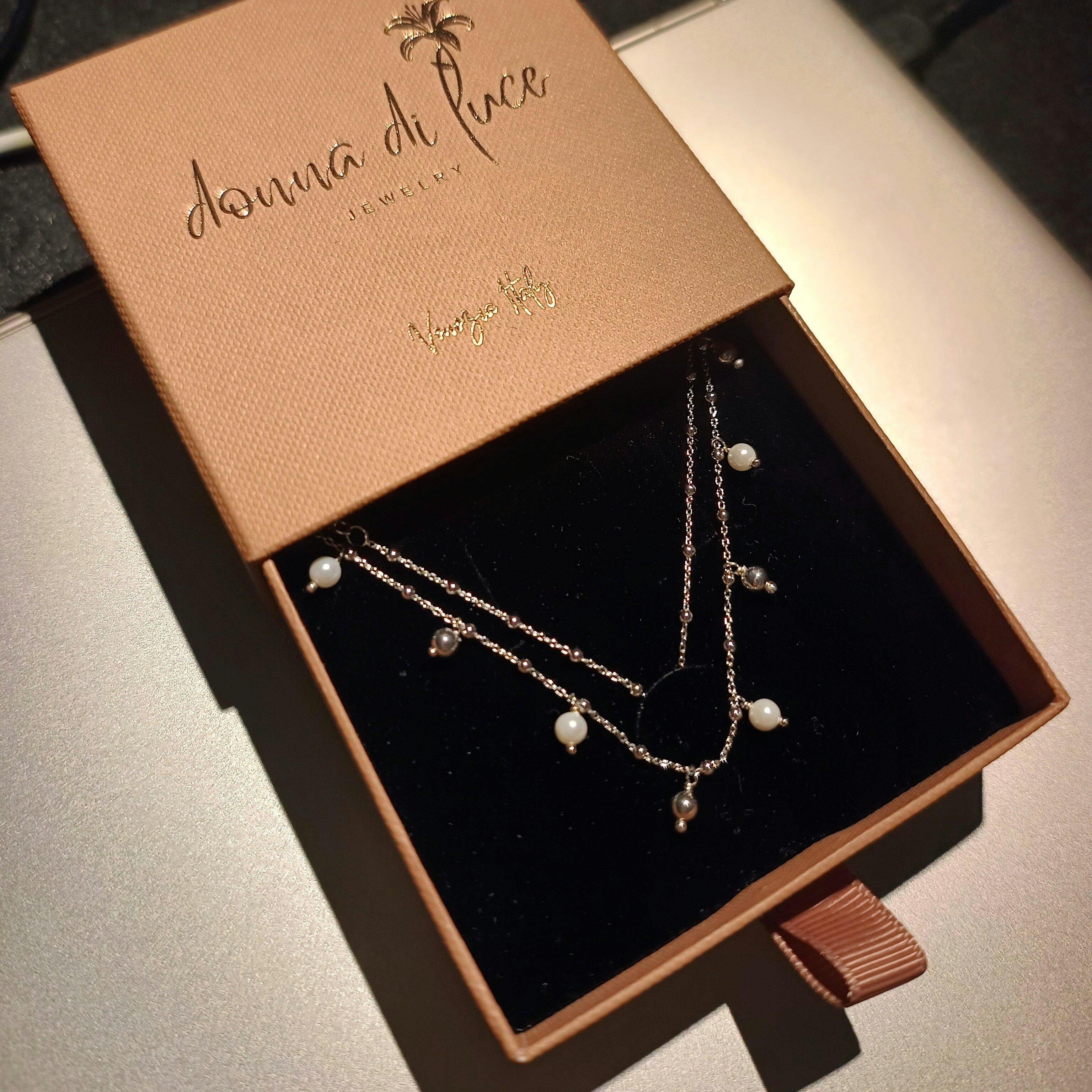 La mia forma sottile si anima di perline color perla e sfere d’argento che si rincorrono lungo un filo leggerissimo, rendendomi facile da indossare, ma mai banale.